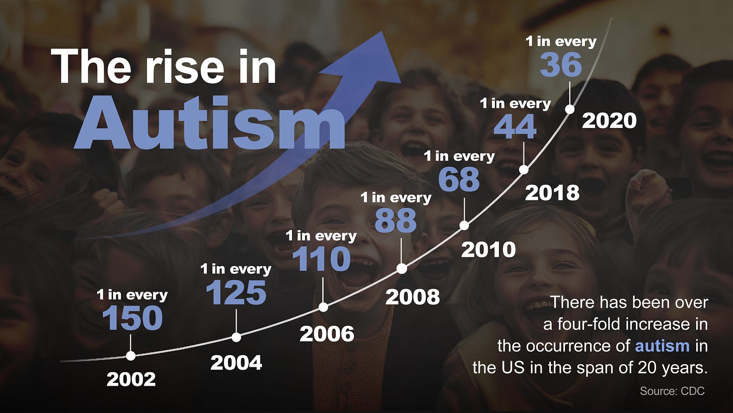 The spike in autism over just one generation is hard to ignore. In 2000, the rate among 8-year-old children was 1 in 150 children in the US. In 2022, the incidence among 8-year-old children is 1 in 32. That spike can’t be fully explained by changes in diagnosis, growing awareness or genetics; genes evolve slowly—on the scale of hundreds to thousands of years. Those factors matter—but they don’t tell the whole story. Something else is happening, and we need to look harder at the world around us.