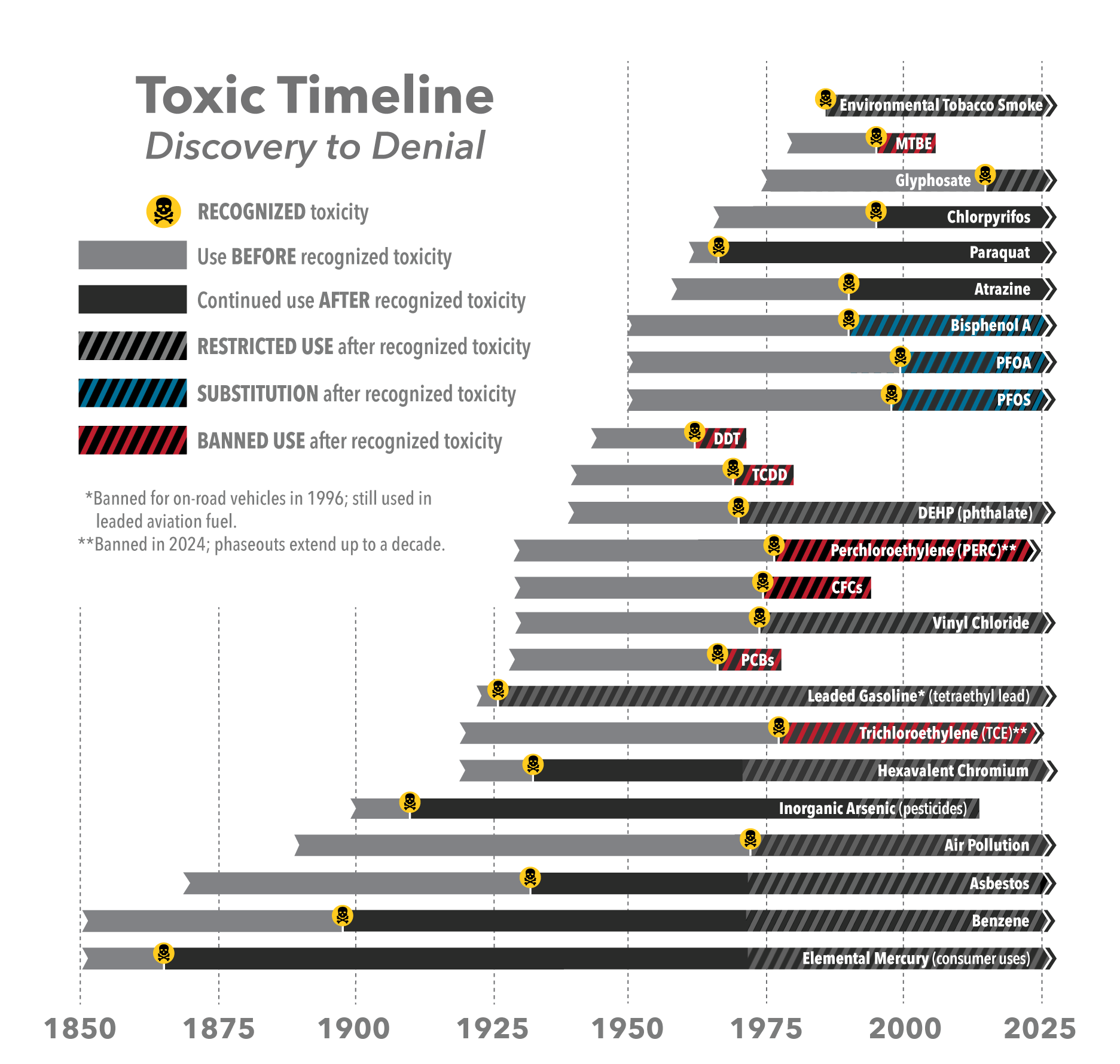 The European Environment Agency captured this pattern in its landmark 2013 report Late Lessons from Early Warnings. Across hundreds of pages, they documented a century of delayed recognition and regulatory failure—from asbestos to benzene, PCBs to DES, leaded gasoline to ozone-destroying CFCs. The same sequence repeats with numbing predictability: an early warning emerges, industry dismisses or buries it, and regulators—outmatched, under-resourced, or politically constrained—wait years or decades to act. When protections finally arrive, the harm is baked into the population.